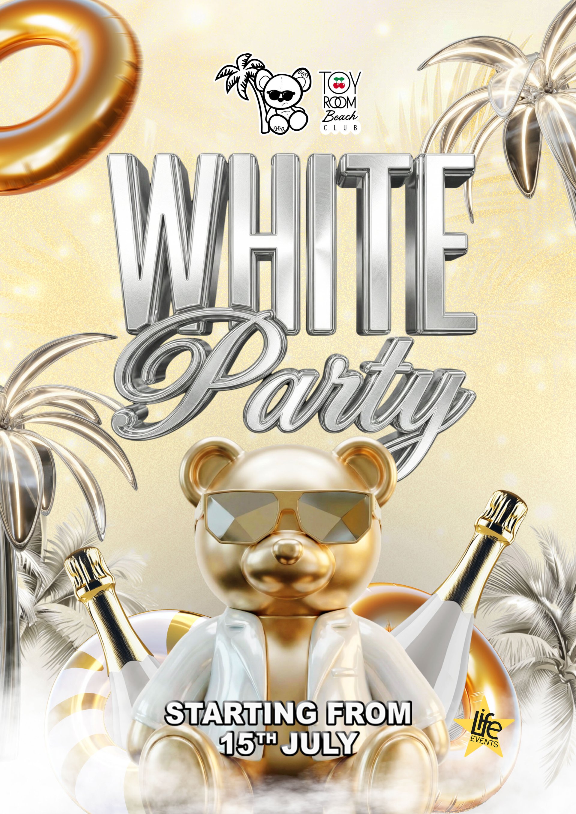 The White Party takes over the Toyroom Beach club! Guests dress in white, DJs set the mood from day to sunset, champagne flows, and the whole venue turns into one clean, high-energy scene with Frank leading the vibe 🤍